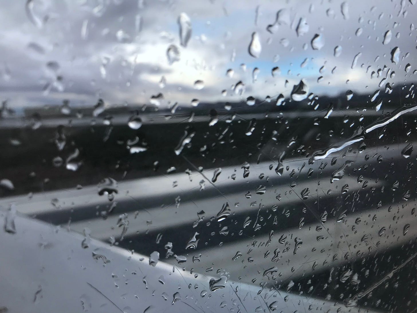 I’m back inside when sky aperture snaps shut, and clouds, bursting in anticipation of the cue, spill themselves into dusk. Rain sluices the windows as I cook dinner. Rain spits at the walls as I curl on the couch with a book, heater blasting. Rain beats on the roof above my bed like I owe it rent.
